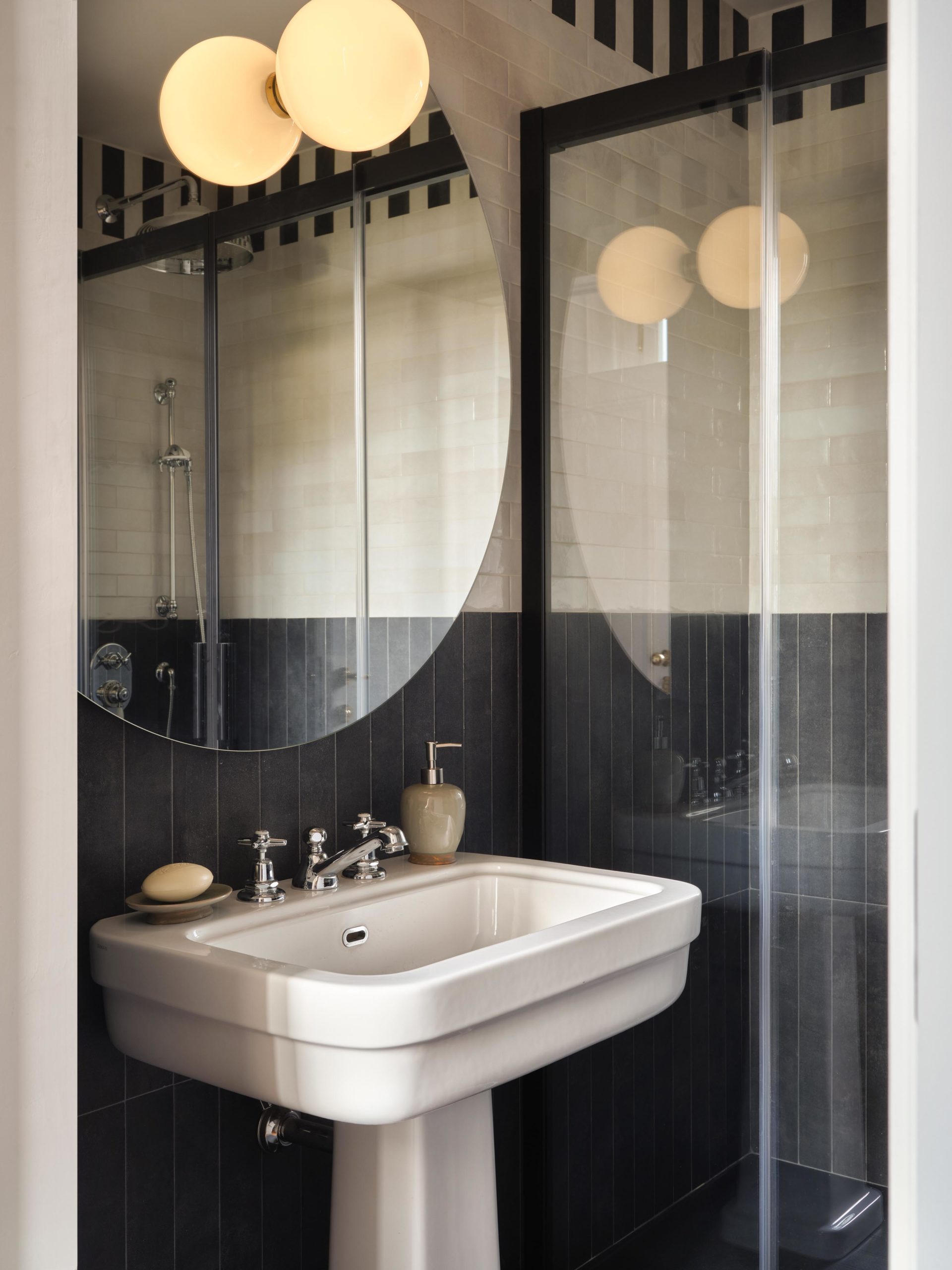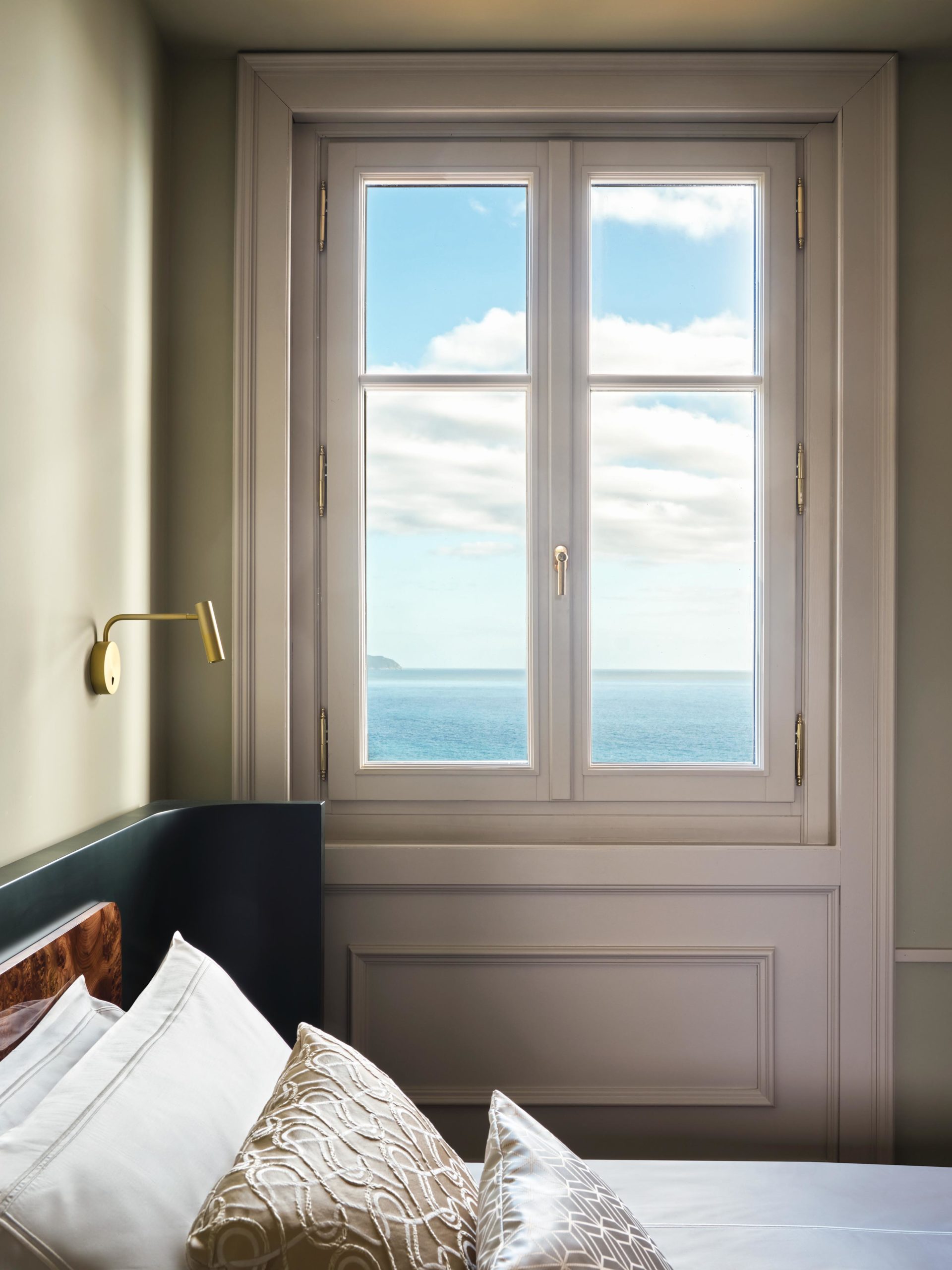 Room E is a self-contained apartment within the villa: spacious and filled with natural light, with a layout that comfortably accommodates up to four guests. Three windows bring soft daylight throughout the space, while the sitting area with double sofa bed and the presence of two en-suite bathrooms offer natural flexibility. The sage-green palette echoes the surrounding Mediterranean vegetation, creating a relaxed and welcoming atmosphere.