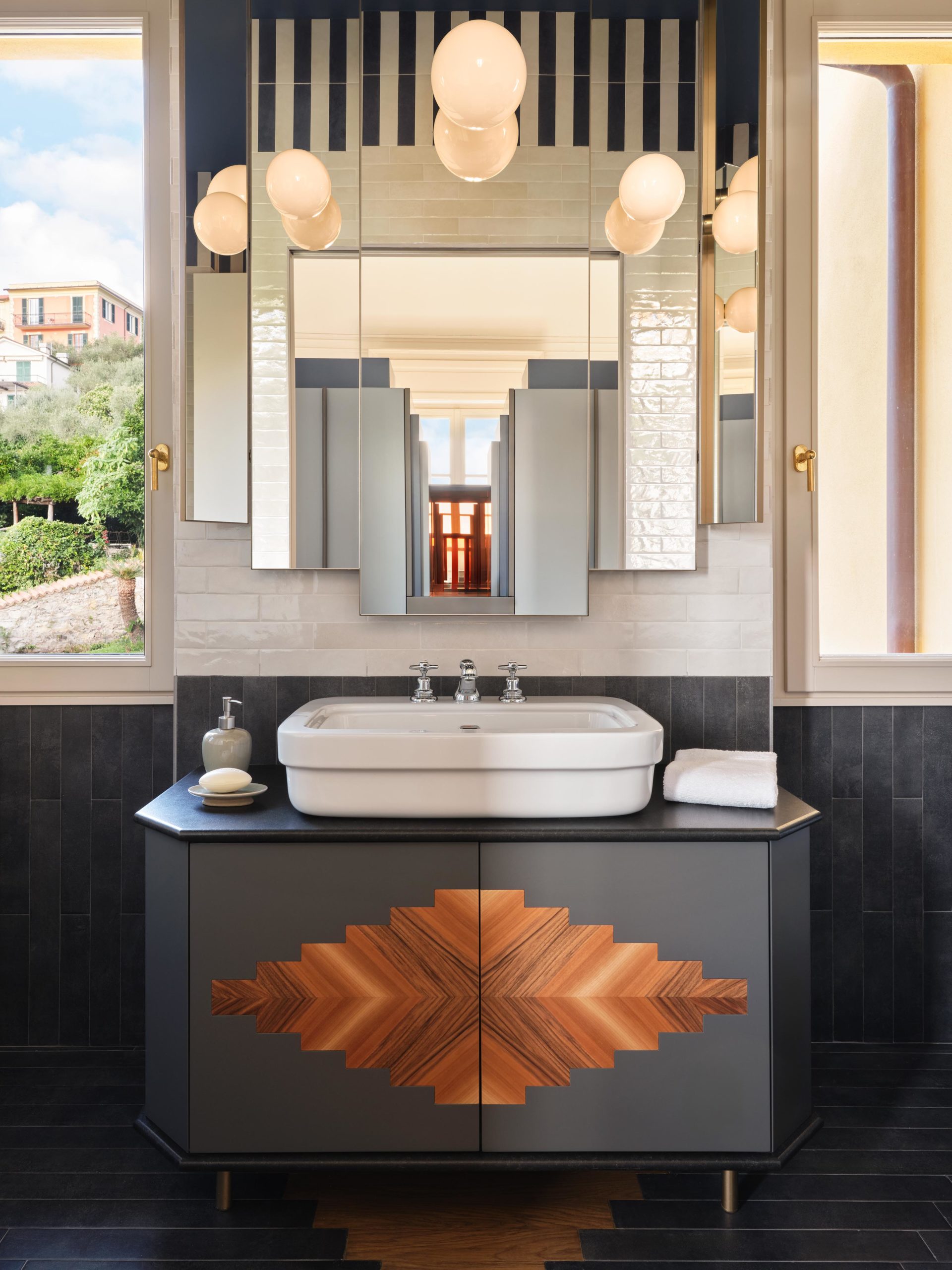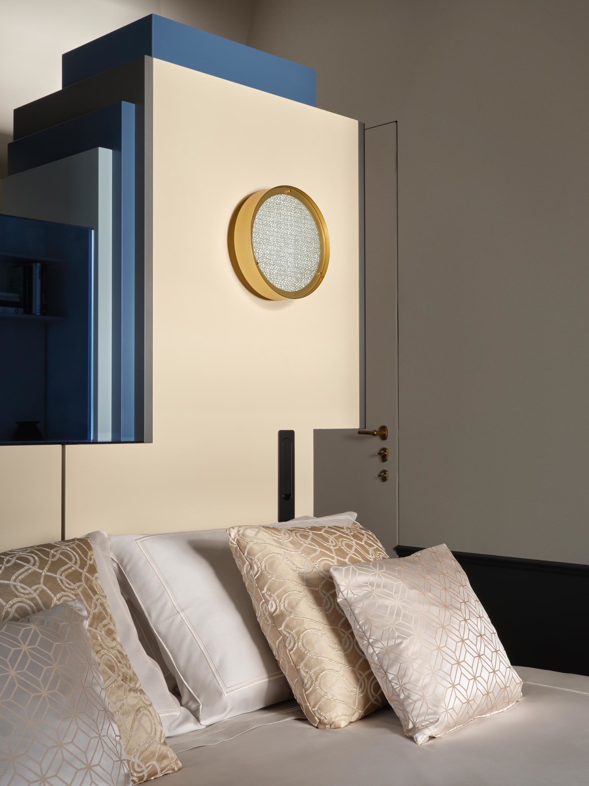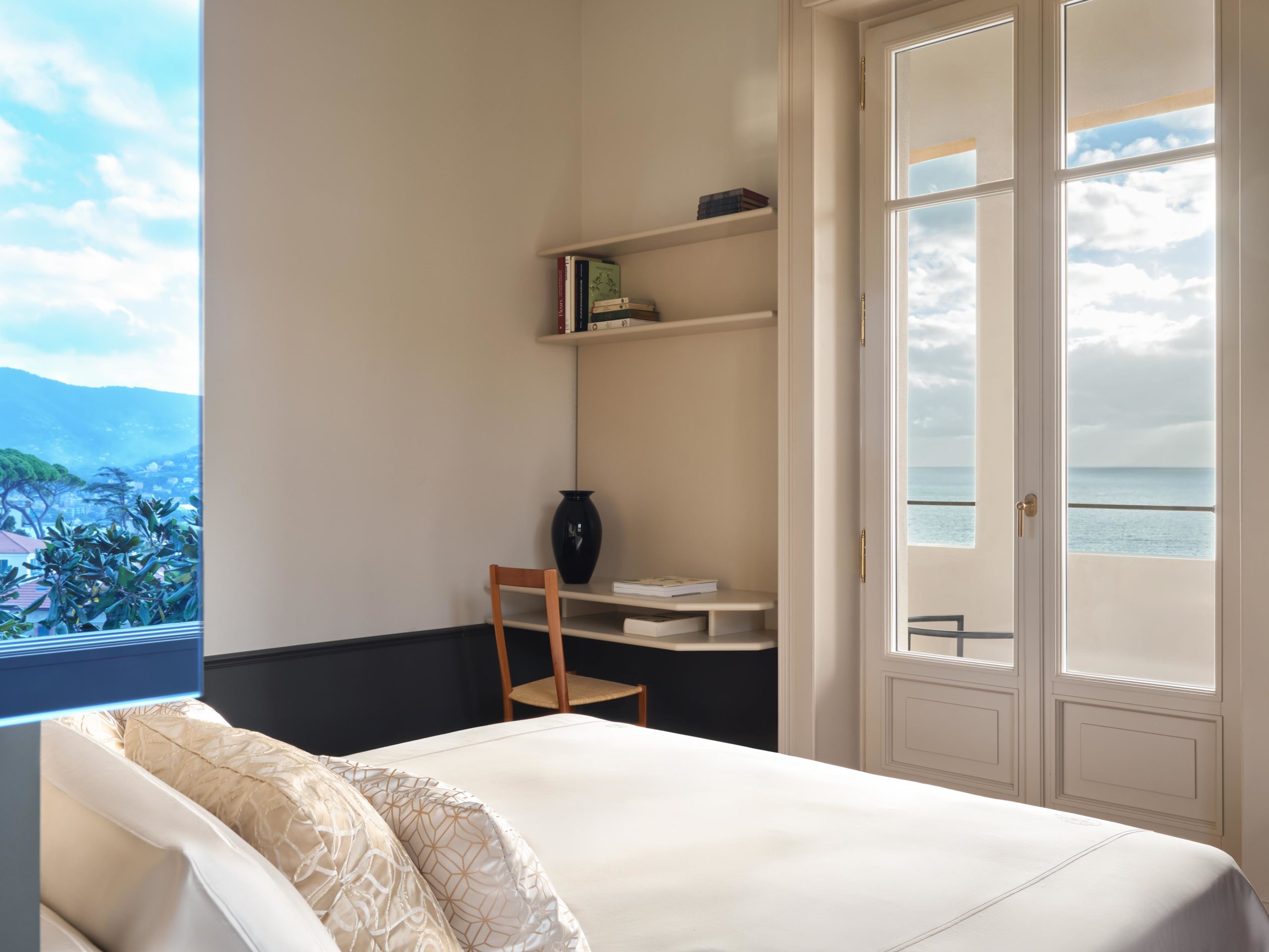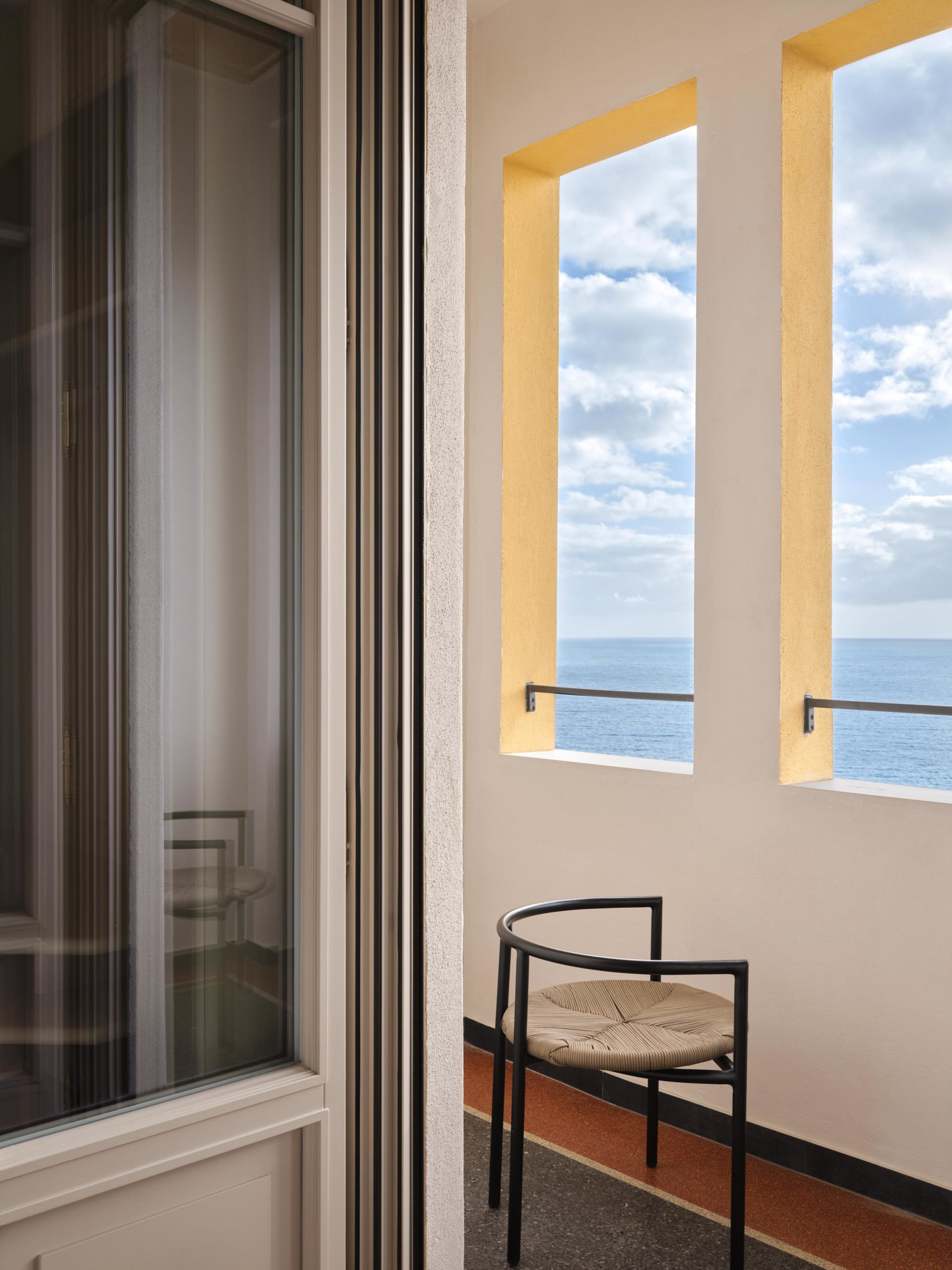 Room M expresses a bright and refined elegance, defined by soft blue-grey tones and a natural balance between indoor and outdoor living. The covered loggia — furnished with seating and a small table — is the perfect spot to start the day with a leisurely breakfast or to enjoy the sunset over the sea. The en-suite bathroom with shower and double windows enhances the sense of light and openness.